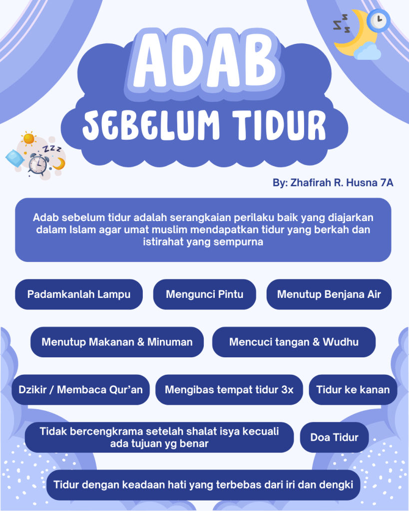 Sebelum tidur, ada baiknya kita siapkan diri dengan kebiasaan yang diajarkan Rasulullah SAW supaya tidur kita lebih berkah dan istirahat jadi sempurna. Poster ini menampilkan langkah sederhana yang mudah diikuti. Yuk, biasakan dan jadikan tidurmu lebih berkualitas! 😴✅